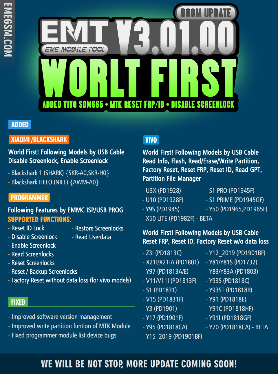 World First! Added No Auth, No Credits Supported for Vivo U3X, U10, Y9S, S1 PRO(PD1945F), S1 PRIME, Y50, X50 LITE etc sdm665 chip models! World First! Added Reset FRP, Reset ID Lock, Factory Reset without data loss for VIVO MTK 6771, 6765, 6763, 6762 models! World First! Added Reset screenlock without data loss for Blackshark 1, Blackshark HELO!